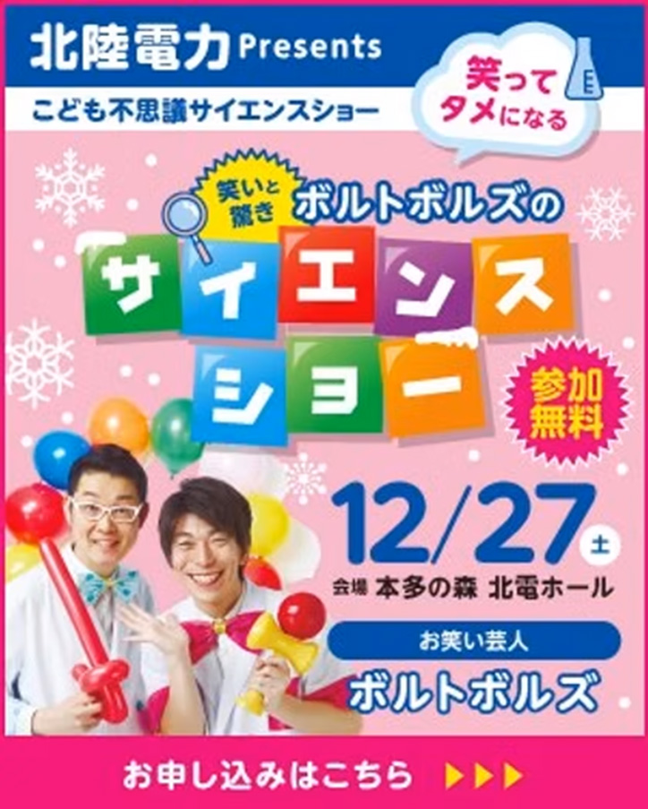 12月27日(土)に石川県金沢市の「本多の森 北電ホール」にて、『北陸電力presents こども不思議サイエンスショー〜笑いと驚き!ボルトボルズの笑ってタメになるサイエンスショー〜』が開催されます