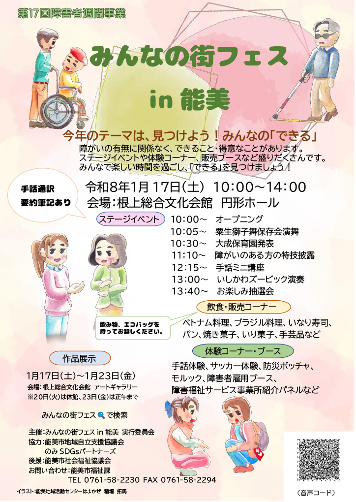 障がいのある人への関心と理解を深めるとともに、障がいのある人があらゆる分野の活動に参加する機会として『みんなの街フェスin能美』が開催されます