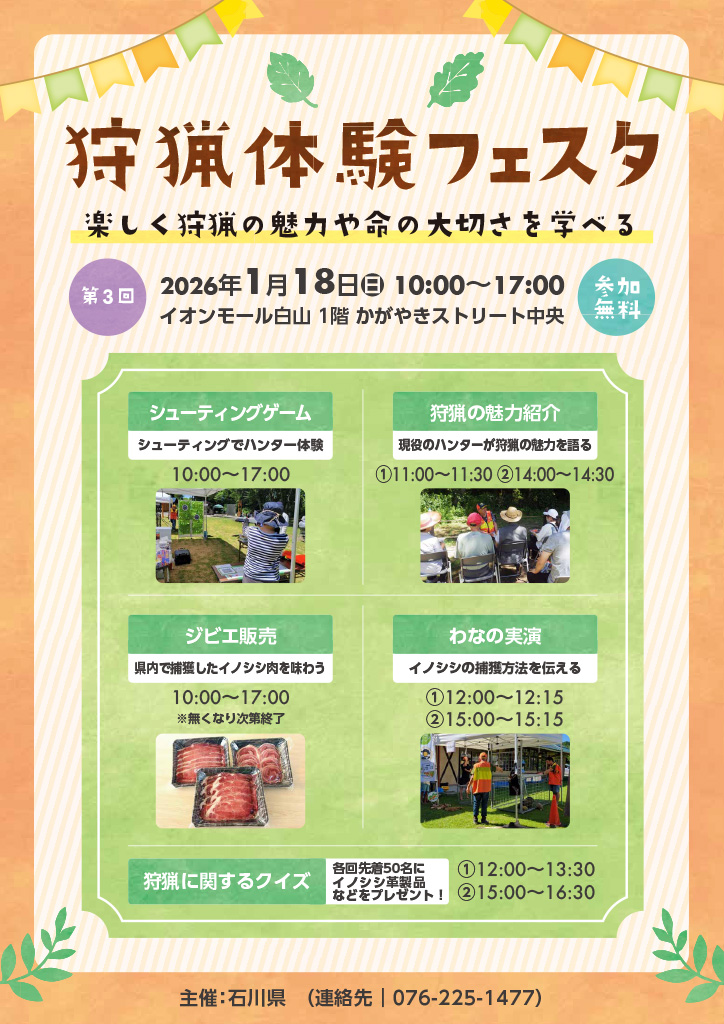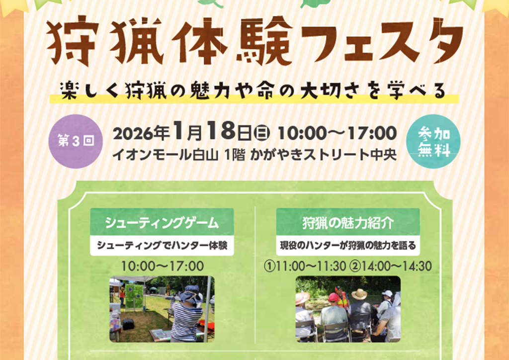 『第3回 狩猟体験フェスタ』が石川県白山市の「イオンモール白山」で2026年1月18日(日)に開催されます