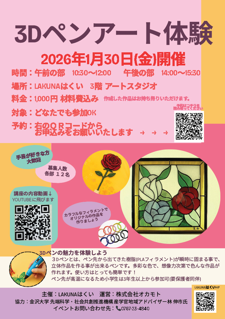 『3Dペンアート体験』が石川県羽咋市の「LAKUNAはくい」で2026年1月30日(金)に開催されます