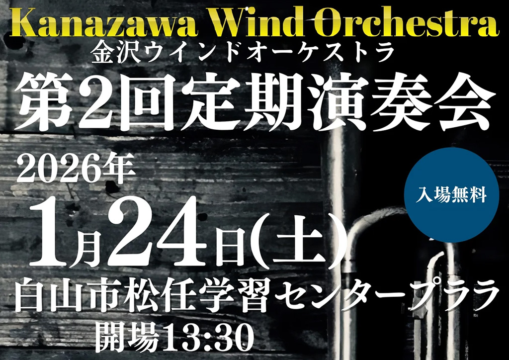 『金沢ウインドオーケストラ 第2回定期演奏会』が石川県白山市の「白山市松任学習センター プララ」で2026年1月24日(土)に開催されます
