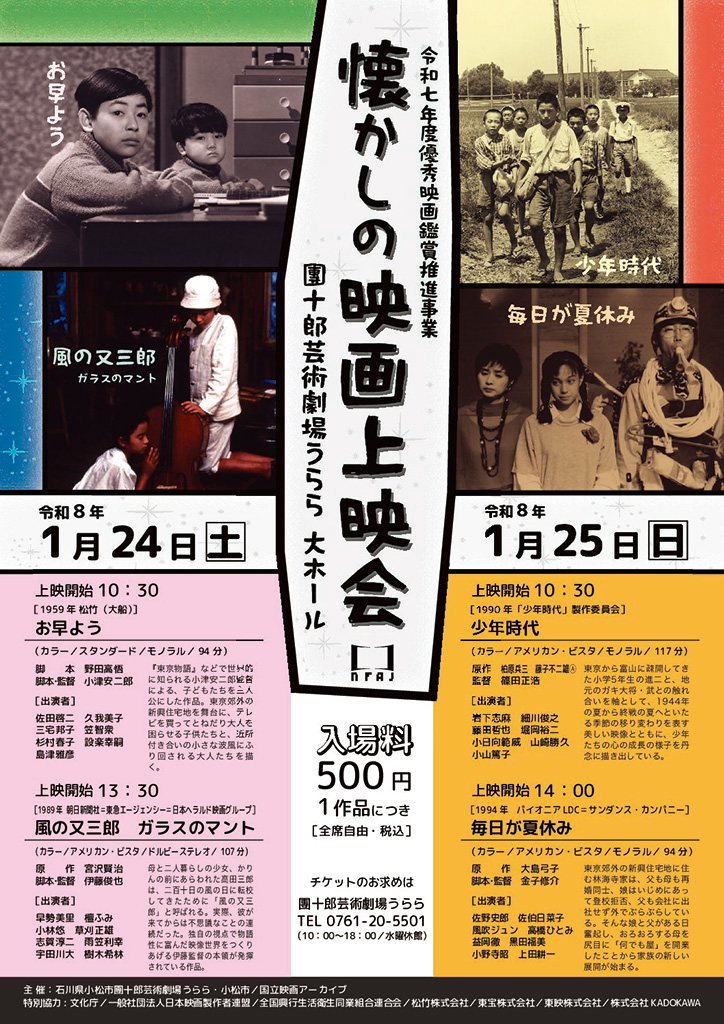 1月24日(土)、1月25日(日)に石川県小松市の「團十郎芸術劇場うらら」にて『令和七年度優秀映画鑑賞推進事業 懐かしの映画上映会』が開催されます