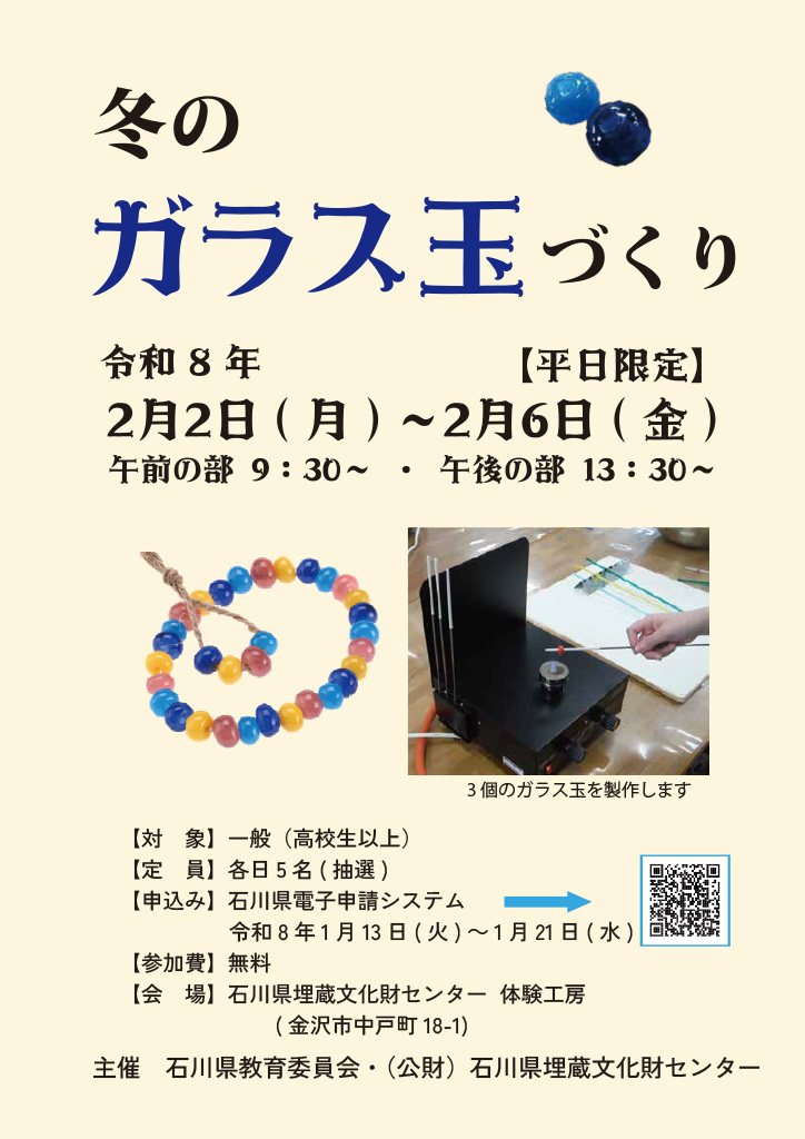 『冬のガラス玉づくり』が石川県金沢市の「石川県埋蔵文化財センター」で2026年2月2日(月)から2月6日(金)まで開催されます