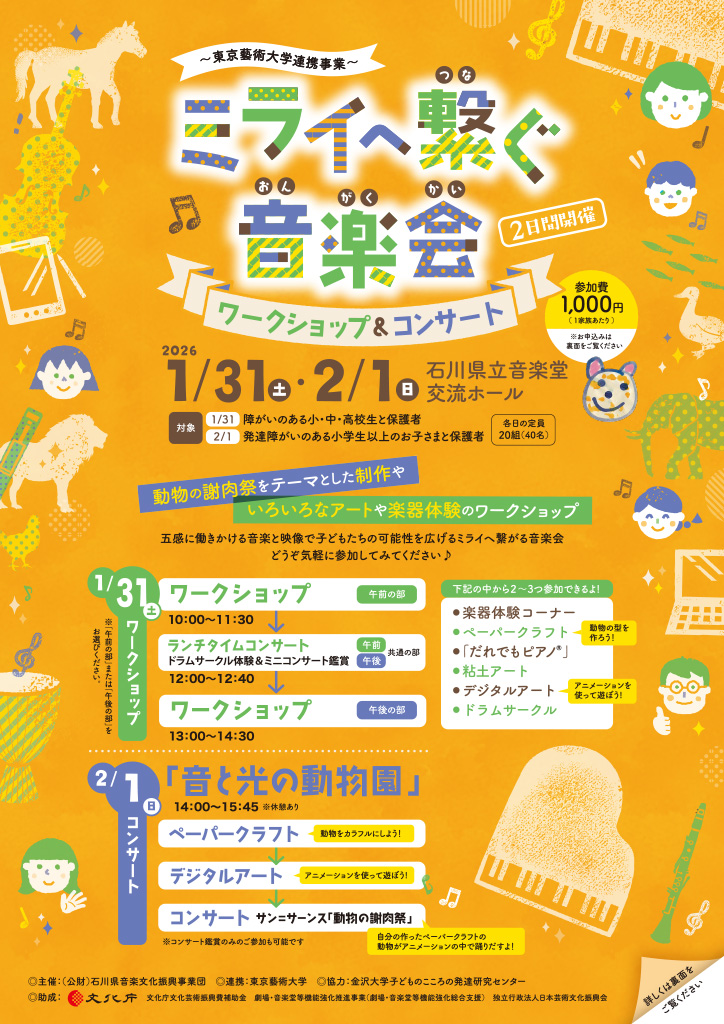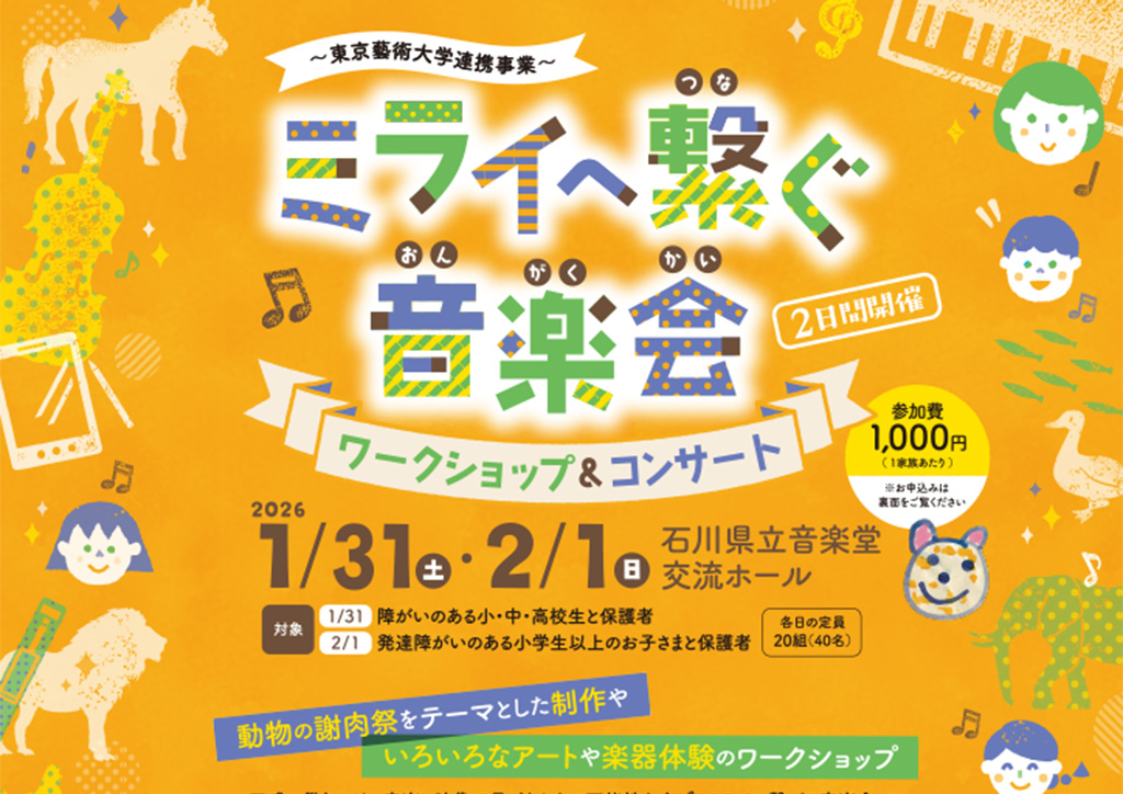 『~東京藝術大学連携事業~ミライへ繋ぐ音楽会 ワークショップ&コンサート』が石川県金沢市の「石川県立音楽堂」で2026年1月31日(土)、2月1日(日)に開催されます