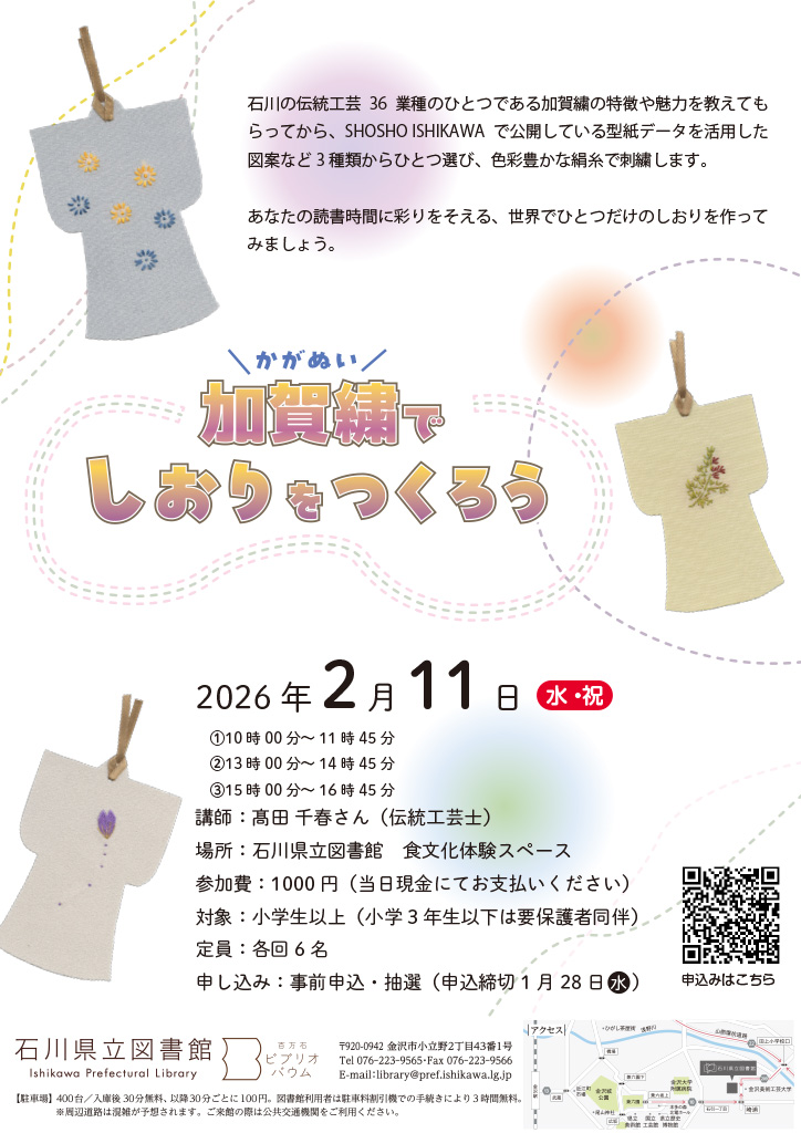 『加賀繍(かがぬい)でしおりをつくろう』が石川県金沢市の「石川県立図書館」で2026年2月11日(水祝)に開催されます