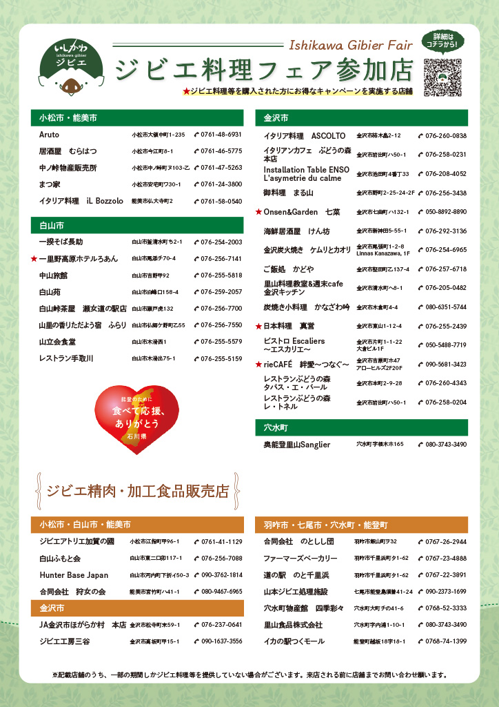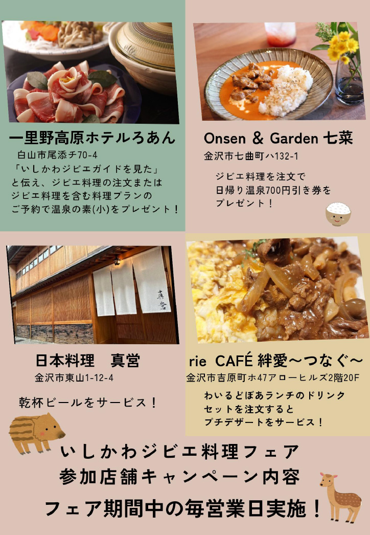 ※ジビエ料理をご注文、もしくはジビエ商品をご購入した際、店員に「いしかわジビエ料理フェアのチラシ・HP等を見た!」とお声かけください