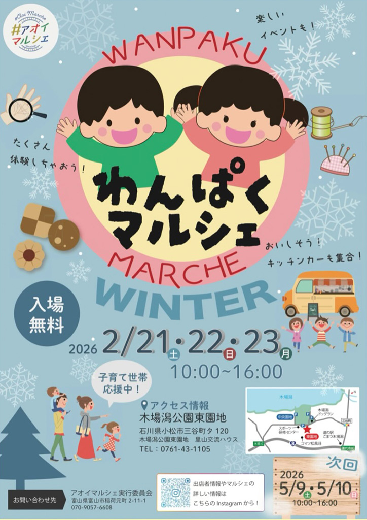 2月21日(土)から2月23日(月祝)まで石川県小松市の「木場潟公園東園地」にて『木場潟わんぱくマルシェ winter』が開催されます