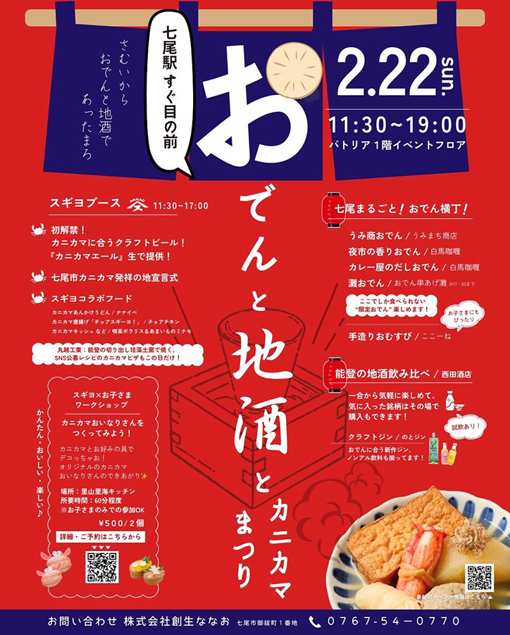 2月22日(日)に石川県七尾市の「パトリア」にて『おでんと地酒とカニカマまつり』が開催されます