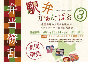 白山・能美石川イベント開催 [12/14]駅弁かぁにばる③がトレインパーク白山で開催(白山市) 『駅弁かぁにばる③』が石川県白山市の「トレインパーク白山」で2025年12月14日(日)に開催されます駅弁かぁにばる③ ... 2025.12.10 白山・能美石川イベント開催