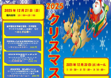 石川イベント金沢開催 [12/20-21]2025クリスマスのつどいがいしかわ子ども交流センターで開催(金沢) 『2025クリスマスのつどい』が石川県金沢市の「いしかわ子ども交流センター」で2025年12月20日(土)、12月21日... 2025.12.10 石川イベント金沢開催