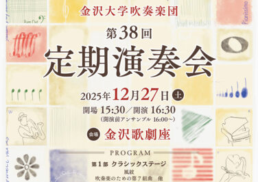 石川イベント金沢開催 [12/27]金沢大学吹奏楽団 第38回定期演奏会が金沢歌劇座で開催(金沢) 『金沢大学吹奏楽団 第38回定期演奏会』が石川県金沢市の「金沢歌劇座」で2025年12月27日(土)に開催されます金沢大... 2025.12.22 石川イベント金沢開催