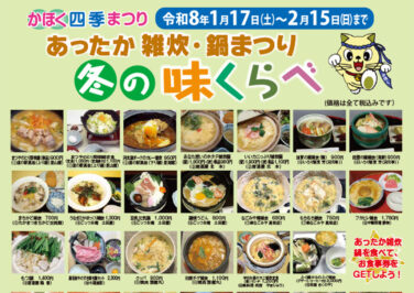 津幡・かほく石川イベント開催 [1/17-2/15]かほく四季まつり ~冬の味くらべ あったか雑炊・鍋まつり~がかほく市内登録飲食店で開催(かほく市) 『かほく四季まつり ~冬の味くらべ あったか雑炊・鍋まつり~』が石川県かほく市の市内登録飲食店で2026年1月17日(土... 2026.01.10 津幡・かほく石川イベント開催