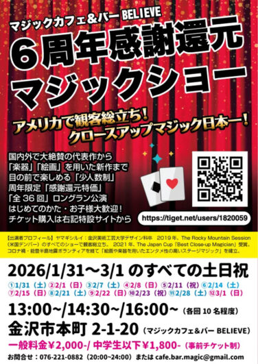 石川イベント金沢開催 [1/31-3/1]6周年感謝還元マジックショーがマジックカフェ&バーBELIEVEで開催(金沢) 『6周年感謝還元マジックショー』が石川県金沢市の「マジックカフェ&バーBELIEVE」で2026年1月31日(土)から3... 2026.01.27 石川イベント金沢開催
