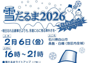 白山・能美石川イベント開催 [2/6]雪だるま祭り2026開催!白山麓桑島・白峰地区が雪だるまでいっぱい♪(白山市) 『雪だるままつり2026』が石川県白山市の桑島&白峰地区で2026年2月6日(金)に開催されます雪だるまでいっぱいになり... 2026.01.12 白山・能美石川イベント開催