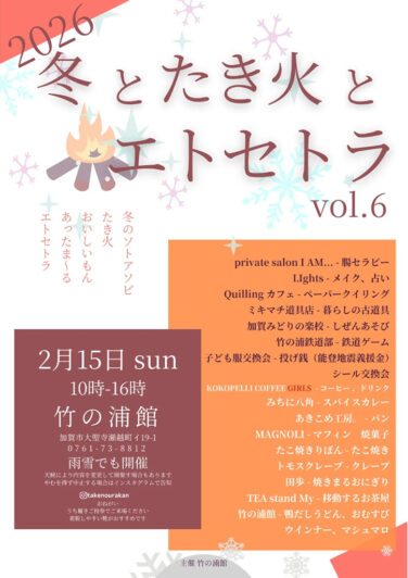 加賀石川イベント開催 [2/15]冬とたき火とエトセトラ vol.6が竹の浦館で開催(加賀) 『冬とたき火とエトセトラ vol.6』が石川県加賀市の「竹の浦館」で2026年2月15日(日)に開催されます冬とたき火と... 2026.01.27 加賀石川イベント開催