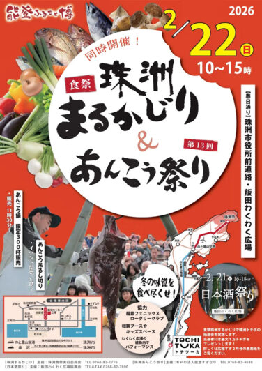 石川イベント能登北部開催 [2/22]食祭 珠洲まるかじり&第13回あんこう祭りが春日通り(珠洲市役所前道路)、飯田わくわく広場で開催(能登珠洲) 『食祭 珠洲まるかじり&第13回あんこう祭り』が石川県珠洲市の「春日通り(珠洲市役所前道路)、飯田わくわく広場」で202... 2026.02.06 石川イベント能登北部開催