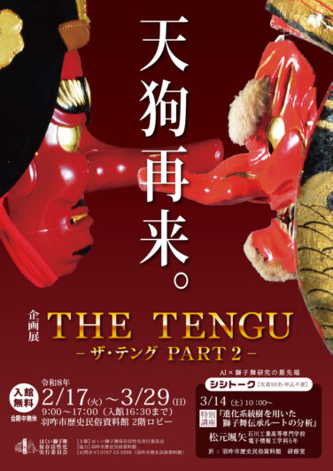 石川イベント能登南部開催 [2/17-3/29]企画展「THE TENGU -ザ・テング PART 2-」が羽咋市歴史民俗資料館で開催(能登羽咋) 『企画展「THE TENGU -ザ・テング PART 2-」』が石川県羽咋市の「羽咋市歴史民俗資料館」で2026年2月1... 2026.03.04 石川イベント能登南部開催