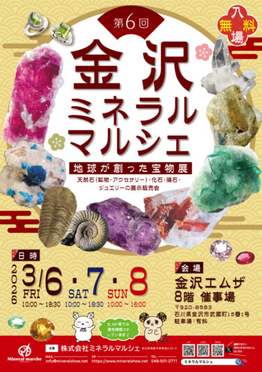 石川イベント金沢開催 [3/6-8]第6回金沢ミネラルマルシェが金沢エムザで開催(金沢) 『第6回 金沢ミネラルマルシェ』が石川県金沢市の「金沢エムザ」で2026年3月6日(金)から3月8日(日)まで開催されま... 2026.03.01 石川イベント金沢開催