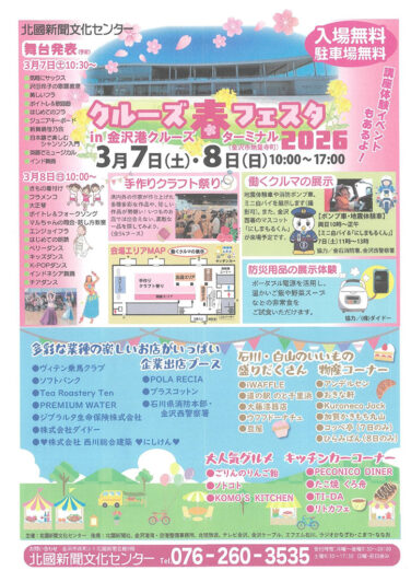 石川イベント金沢開催 [3/7-8]北國新聞文化センター『クルーズ春フェスタ2026 手作り・クラフト祭り』が金沢港クルーズターミナルで開催(金沢) 北國新聞文化センター『クルーズ春フェスタ2026 手作り・クラフト祭り』が石川県金沢市の「金沢港クルーズターミナル」で2... 2026.03.01 石川イベント金沢開催