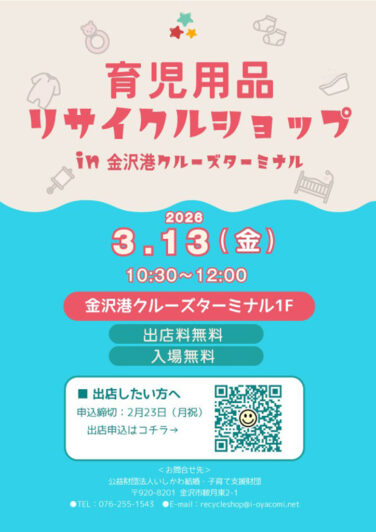 石川イベント金沢開催 [3/13]育児用品リサイクルショップが金沢港クルーズターミナルで開催(金沢) 『育児用品リサイクルショップ』が石川県金沢市の「金沢港クルーズターミナル」で2026年3月13日(金)に開催されます育児... 2026.03.04 石川イベント金沢開催