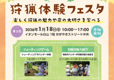 白山・能美石川イベント開催 [1/18]第3回 狩猟体験フェスタがイオンモール白山で開催(白山市) 『第3回 狩猟体験フェスタ』が石川県白山市の「イオンモール白山」で2026年1月18日(日)に開催されます第3回 狩猟体... 2026.01.08 白山・能美石川イベント開催