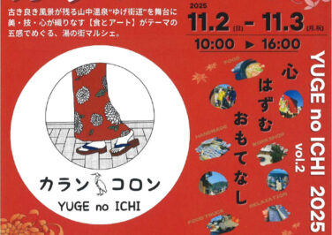 加賀石川イベント開催 [11/2-3]カランコロン YUGE no ICHI 2025が山中温泉南町ゆげ街道で開催(加賀) 『カランコロン YUGE no ICHI 2025』が石川県加賀市の「山中温泉南町ゆげ街道」全域で2025年11月2日(... 2025.10.21 加賀石川イベント開催