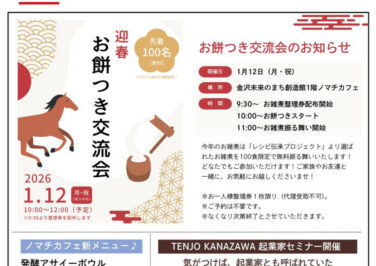 石川イベント金沢開催 [1/12]お餅つき交流会が金沢未来のまち創造館ノマチカフェで開催(金沢) 『お餅つき交流会』が石川県金沢市の「金沢未来のまち創造館ノマチカフェ」で2026年1月12日(月祝)に開催されますお餅つ... 2026.01.06 石川イベント金沢開催