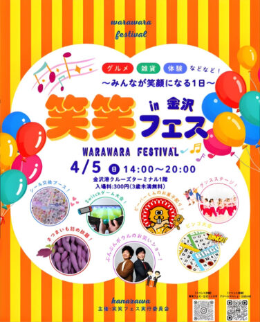 石川イベント金沢開催 [4/5]北陸最大級のエンタメフェス『笑笑フェス』が金沢港クルーズターミナルで開催(金沢) 北陸最大級のエンタメフェス『笑笑フェス』が石川県金沢市の「金沢港クルーズターミナル」で2026年4月5日(日)に開催され... 2026.03.30 石川イベント金沢開催