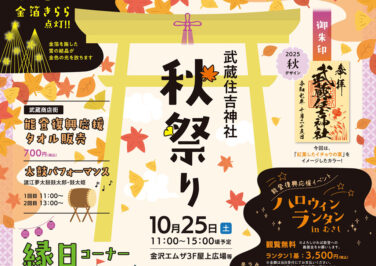 石川イベント金沢 [10/25]武蔵住吉神社秋祭りが金沢エムザで開催(金沢) 『武蔵住吉神社 秋祭り』が石川県金沢市の「金沢エムザ」で2025年10月25日(土)に開催されます武蔵住吉神社 秋祭り@... 2025.10.22 2025.10.29 石川イベント金沢