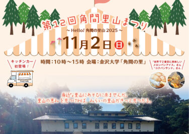 石川イベント金沢開催 [11/2]第12回角間里山まつりが金沢大学角間の里で開催(金沢) 『第12回角間里山まつり』が石川県金沢市の「金沢大学 角間の里」で2025年11月2日(日)に開催されます第12回角間里... 2025.10.22 石川イベント金沢開催