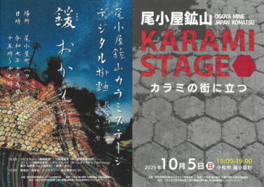 小松石川イベント [10/5]尾小屋鉱山カラミステージ デジタル掛軸が小松市尾小屋町で開催(小松) 『尾小屋鉱山カラミステージ デジタル掛軸』が石川県小松市尾小屋町で2025年10月5日(日)に開催されます尾小屋鉱山カラ... 2025.09.30 2025.10.08 小松石川イベント