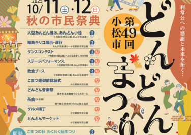 小松石川イベント開催 [10/11-12]第49回小松市どんどんまつりが小松駅周辺で開催(小松市) 『第49回小松市どんどんまつり』が石川県小松市の「小松駅周辺」で2025年10月11日(土)、10月12日(日)に開催さ... 2025.09.30 小松石川イベント開催
