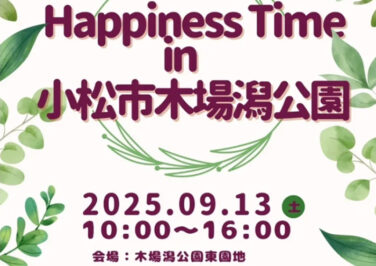 小松石川イベント [9/13]Happiness Time in 小松木場潟公園が東園地で開催(小松市) 『Happiness Time in 小松木場潟公園』が石川県小松市の「木場潟公園 東園地」で2025年9月13日(土)... 2025.09.04 2025.09.18 小松石川イベント