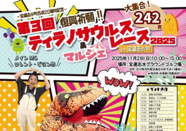 石川イベント能登南部開催 [11/2]第3回 復興祈願 ティラノサウルスレース&マルシェ2025 in 宝達志水町開催(能登・宝達志水) 『第3回 復興祈願 ティラノサウルスレース&マルシェ2025 in 宝達志水町』が石川県羽咋郡宝達志水町の「宝達志水グラ... 2025.10.24 石川イベント能登南部開催