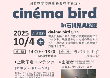 石川イベント能登北部 [10/4]cinéma bird in 石川県奥能登がラポルトすずで開催(能登・珠洲) 『cinéma bird in 石川県奥能登』が石川県珠洲市の「ラポルトすず」で2025年10月4日(土)に開催されます... 2025.09.21 2025.10.08 石川イベント能登北部