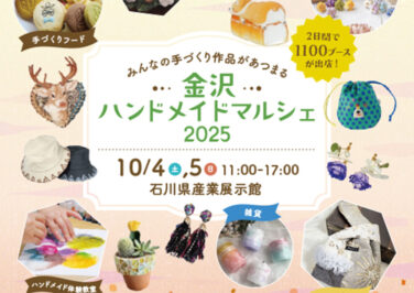 石川イベント金沢 [10/4-5]金沢ハンドメイドマルシェ2025が石川県産業展示館で開催(金沢) 『金沢ハンドメイドマルシェ2025』が石川県金沢市の「石川県産業展示館 3号館」で2025年10月4日(土)、10月5日... 2025.09.21 2025.10.08 石川イベント金沢
