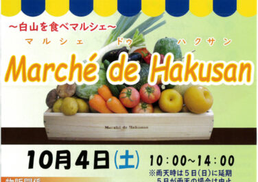 白山・能美石川イベント [10/4]~白山を食べマルシェ~ Marché de Hakusan(マルシェドゥハクサン)が松任駅南広場で開催(白山市) 『~白山を食べマルシェ~ Marché de Hakusan(マルシェドゥハクサン)』が石川県白山市の「松任駅南広場」で... 2025.09.21 2025.10.08 白山・能美石川イベント