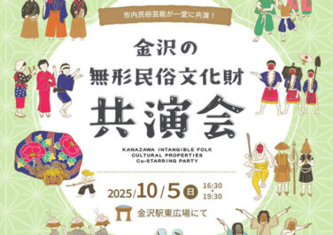 石川イベント金沢 [10/5]金沢の無形民俗文化財共演会2025が金沢駅東広場で開催(金沢) 『金沢の無形民俗文化財共演会2025』が石川県金沢市の「金沢駅東広場」で2025年10月5日(日)に開催されます金沢の無... 2025.09.21 2025.10.08 石川イベント金沢