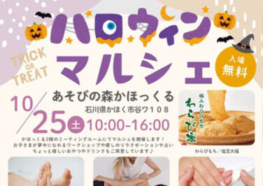 津幡・かほく石川イベント開催 [10/25]ハロウィンマルシェがあそびの森 かほっくるで開催(かほく市) 『ハロウィンマルシェ』が石川県かほく市の「あそびの森 かほっくる」で2025年10月25日(土)に開催されますハロウィン... 2025.10.15 津幡・かほく石川イベント開催