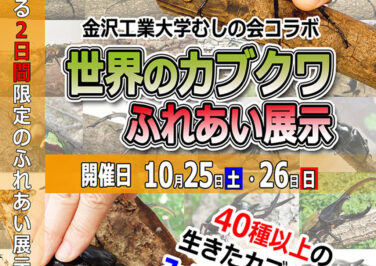 白山・能美石川イベント開催 [10/25-26]世界のカブクワふれあい展示が石川県ふれあい昆虫館で開催(白山市) 『世界のカブクワふれあい展示』が石川県白山市の「石川県ふれあい昆虫館」で2025年10月25日(土)、10月26日(日)... 2025.10.15 白山・能美石川イベント開催