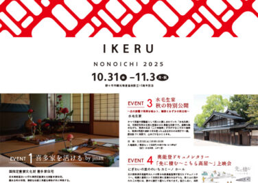 石川イベント野々市開催 [10/31-11/3]IKERU NONOICHI 2025が国指定重要文化財喜多家住宅や野々市市内で開催(野々市) 『IKERU NONOICHI 2025』が石川県野々市市の「国指定重要文化財喜多家住宅」や他野々市市内各会場で2025... 2025.10.15 2025.10.17 石川イベント野々市開催