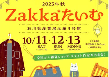 石川イベント金沢開催 [10/11-13]Zakka*たいむvol.12が石川県産業展示館で開催(金沢) 『Zakka*たいむvol.12』が石川県金沢市の「石川県産業展示館 3号館」で2025年10月11日(土)から10月1... 2025.10.01 石川イベント金沢開催