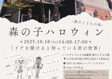 石川イベント能登南部開催 [10/18]森の子ハロウィンがハートランドヒルズin能登 森のこどもの家で開催(能登志賀町) 『森の子ハロウィン』が石川県羽咋郡志賀町の「ハートランドヒルズin能登 No.18森のこどもの家」で2025年10月18... 2025.10.10 石川イベント能登南部開催