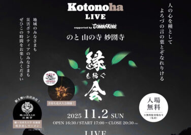 石川イベント能登南部開催 [11/2]Kotonoha LIVE〜縁を紡ぐ会〜がのと山の寺 妙國寺で開催(能登七尾) 『Kotonoha LIVE〜縁を紡ぐ会〜』が石川県七尾市の「のと 山の寺 妙國寺」で2025年11月2日(日)に開催さ... 2025.10.19 石川イベント能登南部開催