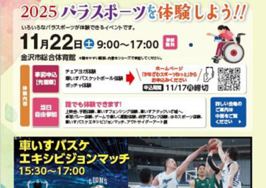 石川イベント金沢開催 [11/22]パラスポーツを体験しよう!!が金沢市総合体育館で開催(金沢) 『パラスポーツを体験しよう!!』が石川県金沢市の「金沢市総合体育館」で2025年11月22日(土)に開催されますパラスポ... 2025.11.18 石川イベント金沢開催