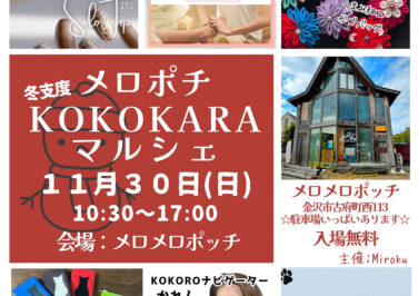 石川イベント金沢開催 [11/30]メロポチKOKOKARAマルシェがメロメロポッチで開催(金沢) 『メロポチKOKOKARAマルシェ』が石川県金沢市の「メロメロポッチ」で2025年11月30日(日)に開催されますメロポ... 2025.11.18 石川イベント金沢開催
