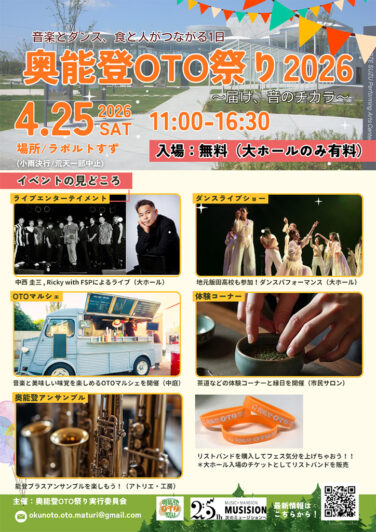 石川イベント能登北部開催 [4/25]奥能登OTO祭り2026〜届け、音のチカラ〜がラポルトすずで開催(能登珠洲) 『奥能登OTO祭り2026~届け、音のチカラ~』が石川県珠洲市の「ラポルトすず」にて2026年4月25日(土)に開催され... 2026.04.23 石川イベント能登北部開催
